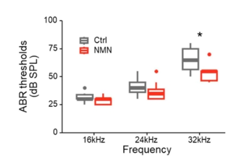 为了确定NMN 对与年龄相关的听力损失的影响,给12周大的小鼠喂食500mg/kg/天的NMN,持续13周。结果表明,与喂食水的对照小鼠相比,接受NMN治疗的小鼠的ABR阈值明显较低,这表明NMN抑制了与年龄相关的听力损失的进展。